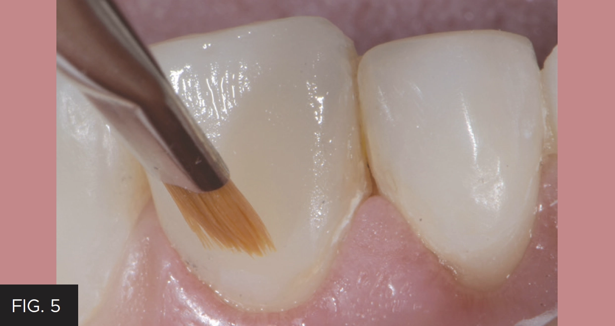 Subsequent layers of Evanesce A1 Universal and B1 Enamel were then placed, and light-cured in 2-3 increments per tooth. Placement and adaptation to the tooth was achieved using a Composite Ninja (Clinician’s Choice) and OptraSculpt Pads (Ivoclar). Tints were sparingly applied as needed to this layer. A Composculpt #1/2 (Hu-Friedy) instrument was useful in establishing facial lobe development, thus creating depressions for the final layer of Evanesce Enamel Clear to provide the illusion of depth. Each increment and layer of composite was smoothed and blended into the surrounding tooth structure and previous layer using a #3 composite brush (Cosmedent) lightly coated with ResinBlend LV Composite Blending Resin (Clinician’s Choice). (FIG 5)