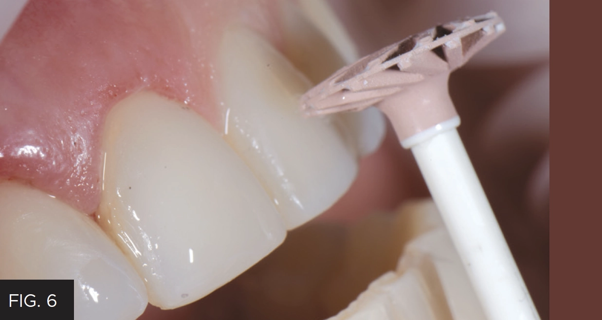 The patient’s natural teeth lacked incisal translucency and facial texture and therefore declined having it included in her final restorations. With the lingual contours and incisal length and thickness established in the wax-up successfully transferred from the lingual matrix to the final restorations, only minimal finishing was necessary. The desired facial contours and line angles were traced onto the composite surface with a pencil. Coarse and medium Contours Finishing and Polishing Discs (Clinician’s Choice) were used to shape the composites using the pencil lines as guides. Fine and superfine discs completed the disc sequence. A.S.A.P. Dailies All Surface Access Diamond Polishers (Clinician’s Choice) were used to quickly achieve a very high luster polish. (FIG 6) The purple Pre-polisher was followed by the peach Final High Shine polisher. Each polisher was used with light pressure for 15 – 20 seconds per surface, per tooth.