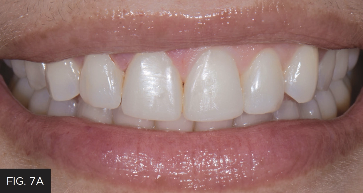 Same-day photos were taken, and the patient was thrilled with the esthetic result. Later, upon critical analysis of the clinical photos, it was determined that tooth #8 could be lengthened slightly to better match tooth #9. At the subsequent follow-up appointment, the patient was shown this slight length discrepancy using Keynote. She understood and agreed to this minor change. Once the modification was made to tooth #8, the patient loved the way her smile and bite felt now that it more closely mirrored tooth #9. (FIG 7A, 7B)