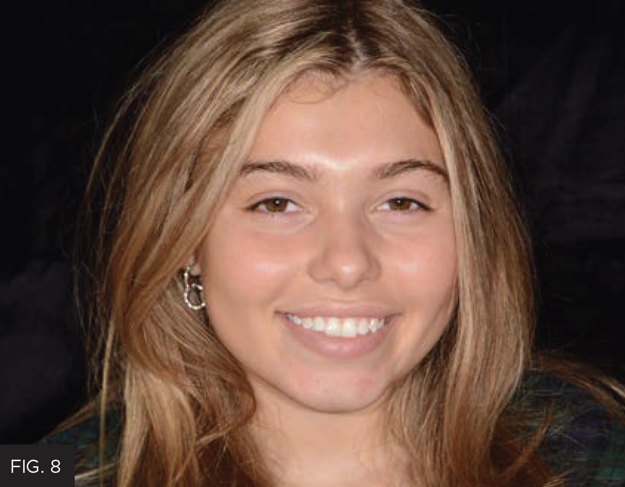 The patient was extremely pleased with the final result. (FIG. 7 and 8) Moreover, the attention paid to blending the composite into the tooth for an invisible restoration also created maximum retention in order for her to avoid another unfortunate negative dental experience.