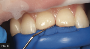 The lingual putty or Template matrix of the diagnostic wax-up was then placed over the prepared teeth and an explorer was used to gently score the matrix to aid in the placement location of the initial composite lingual shelf using Evanesce FX Enamel White composite. (FIG. 8) It’s important to limit the thickness of this initial lingual shelf to 0.5mm. If this layer is too thick you may not be able to place sufficient thicknesses of the subsequent dentin and enamel layers. This FX Enamel White layer was placed on both maxillary central incisors and was polymerized simultaneously. (FIG. 9)