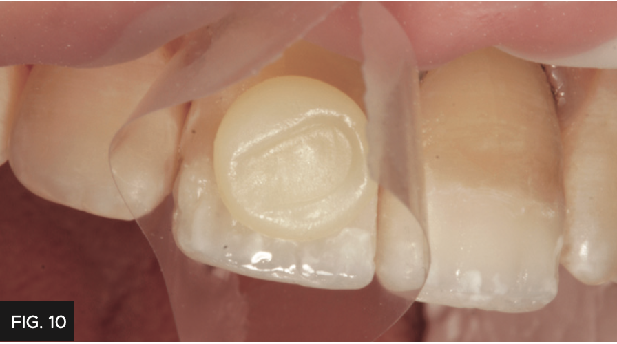 Mylar strips were then placed in the proximal contacts of both central incisors and utilizing the pull through technique to build the final enamel layer using Evanesce B1 Enamel. (FIG. 10) Although not depicted in these clinical images, the pull through technique is performed by placing composite on the facial interproximal space. I gently cover the facial composite with the Mylar strip then pull the Mylar toward the lingual surface which pulls the uncured composite interproximally to effectively close the interproximal space, followed by light polymerization. An Esthetic Contouring Gold Grip instrument (Clinician’s Choice) was then used to shape the final enamel layer and to develop the primary anatomy of the tooth. A #3 artists brush moistened with modeling resin (ResinBlend LV, Clinician’s Choice) was then used to smooth and finesse the final enamel layer before light polymerization.