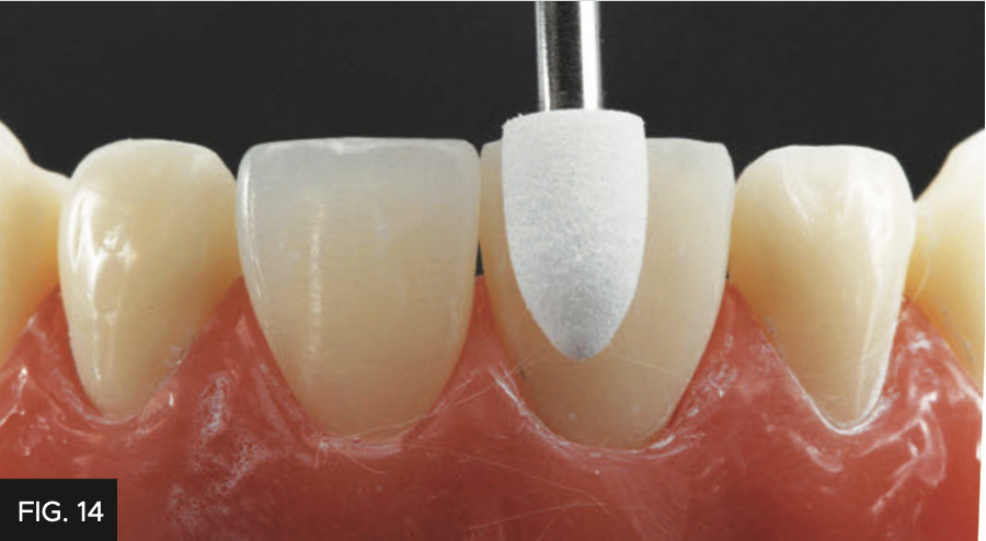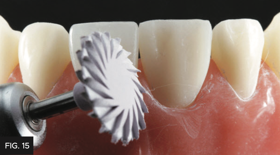 These depressions created with the diamond bur was made more subtle and naturally flowing using various shapes of the Contours Coarse Anatomy Trimmers (Clinician’s Choice) containing 90-micron aluminum oxide particles. (FIG. 14)