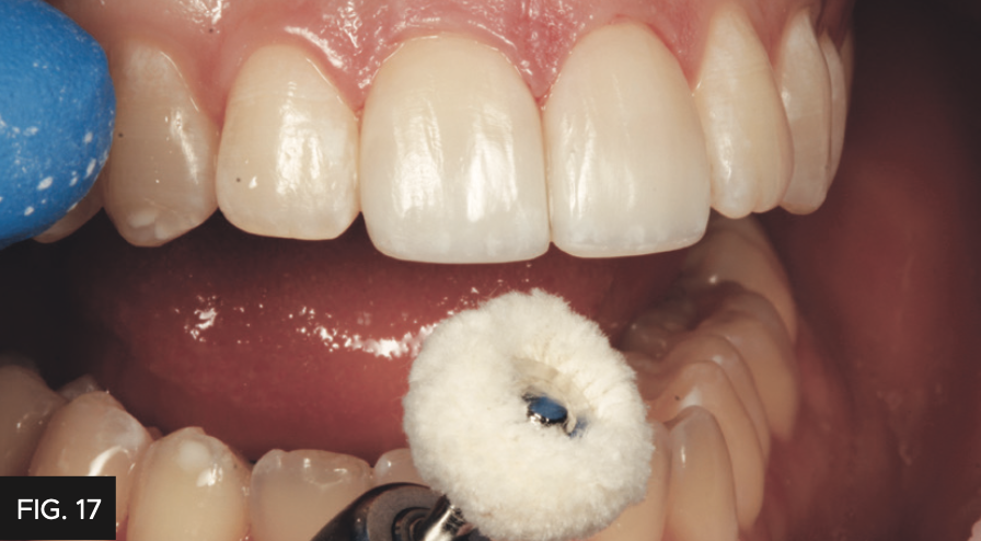 If a higher gloss is desired, I use an aluminum oxide paste, Enamelize (Cosmedent) applied with a Final Shine Cotton Polishing Wheel (Clinician’s Choice) at 25,000 RPM to give the final restoration a very lustrous finish that blends seamlessly with the rest of the patient’s dentition. (FIG. 17)
