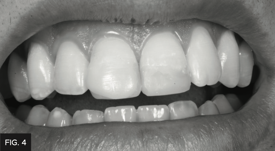 A 21-year-old college student returning home for school break was referred to my office by his dentist. As a result of a skateboard accident from a few months ago, he traumatized both maxillary central incisors. The patient presented with approximately 30% of the incisal portions of both his maxillary central incisors missing which was replaced by two composite restorations that did not match the shade or shape of the remaining native teeth. (FIG. 1 and 2)